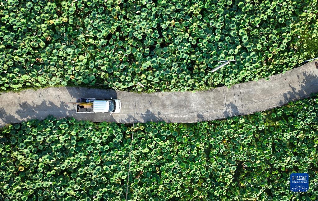 在江西省广昌县塘坊镇淇田村,木偶剧团的货车在莲塘间穿行,前往大株村演出(8月10日摄,无人机照片)。