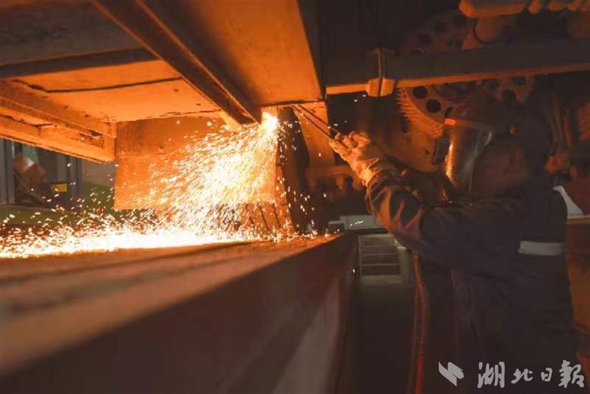 8月16日上午,天气炎热,武汉市汉阳区陶家岭保养车间,电焊工们依然在车间焊接大梁。电焊火花闪着耀眼的光芒四射开来,为不被火花烫伤,他们不得不穿着厚厚的工作服,把全身紧紧包裹。尽管有电风扇,汗水依然湿透了他们衣服。