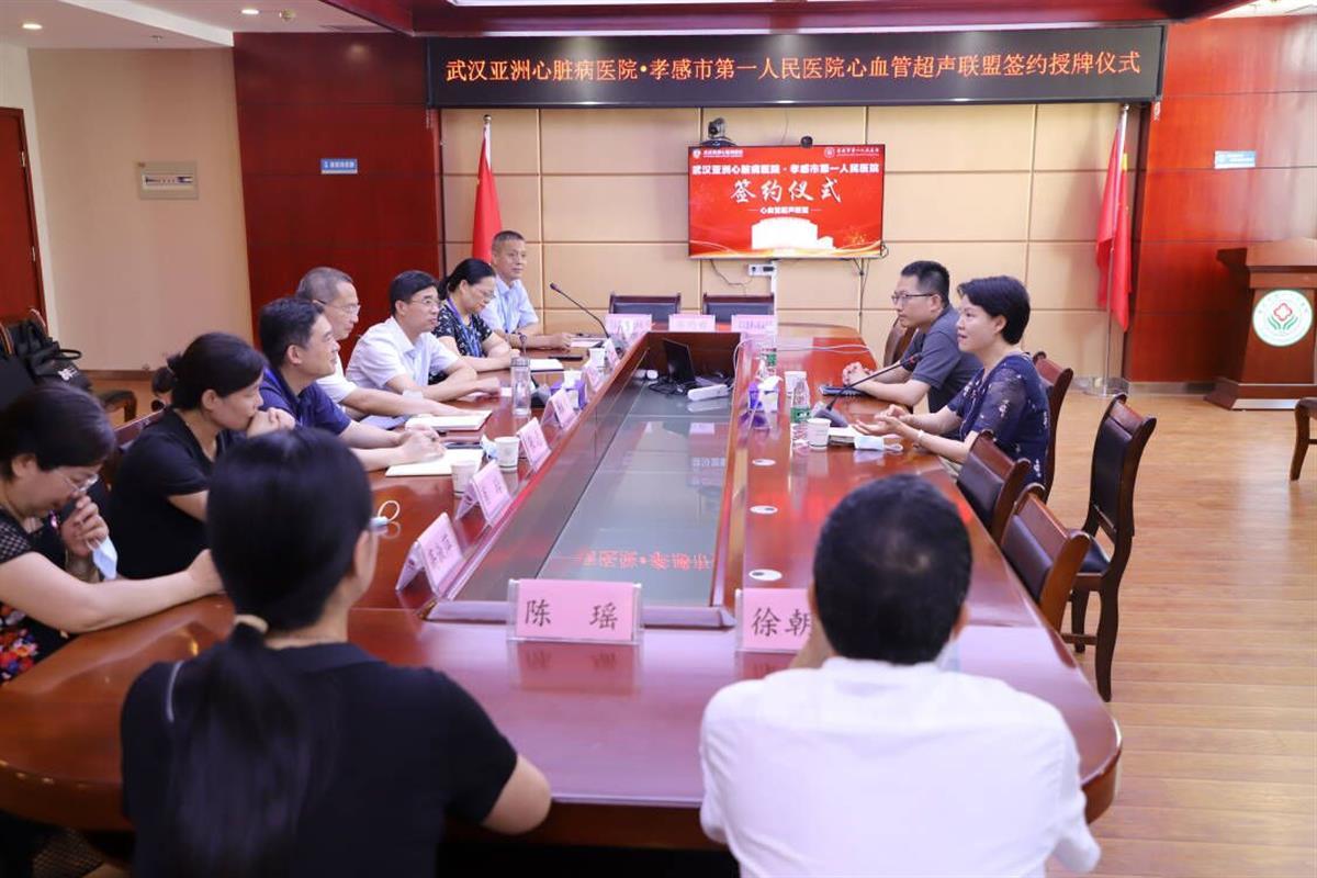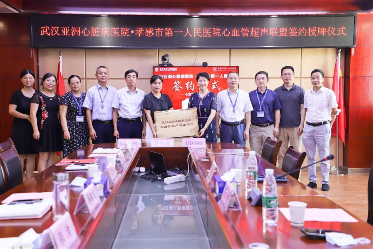 8月15日,孝感市第一人民医院与武汉亚洲心脏病医院举行心血管超声联盟签约授牌仪式。武汉亚洲心脏病医院影像中心主任马小静、社会服务部部长陆晓风,市一医院党委书记杨鹏鸣、院长代立武等院领导及医院发展部、超声影像科、心血管内科负责人等出席授牌仪式。