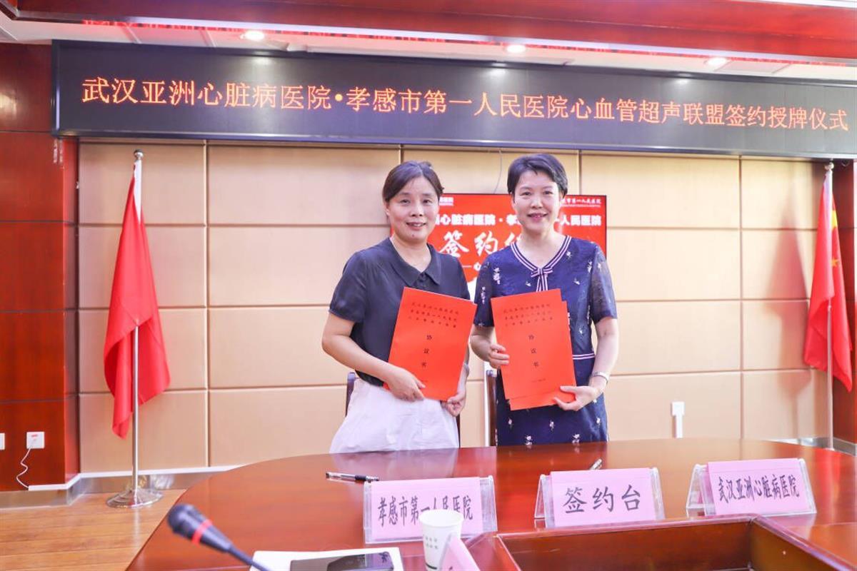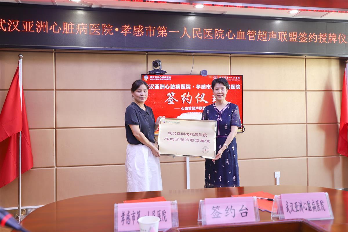 马小静与肖玲签署心血管超声联盟协议书,并授与孝感市第一人民医院“武汉亚洲心脏病医院心血管超声联盟单位”牌匾。