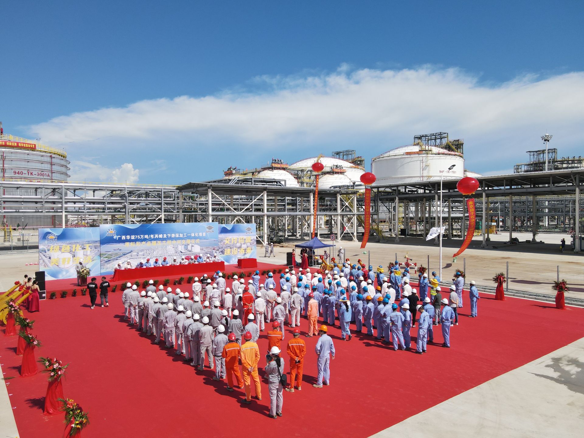 8月15日,盛夏似火,烈日当空。钦州,广西华谊新材料有限公司建设现场,随着五彩的焰火直冲云霄,人群中迸发出热烈的欢呼和掌声——广西华谊75万吨/年丙烯及下游深加工一体化项目原料和产品罐区工程,当天正式中交。这意味着,项目由建设阶段正式转入试运行和生产阶段。