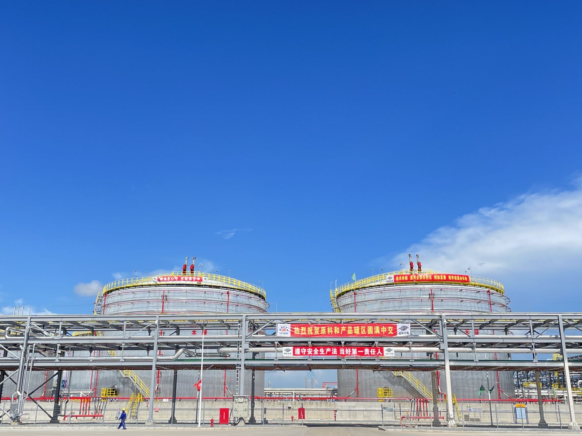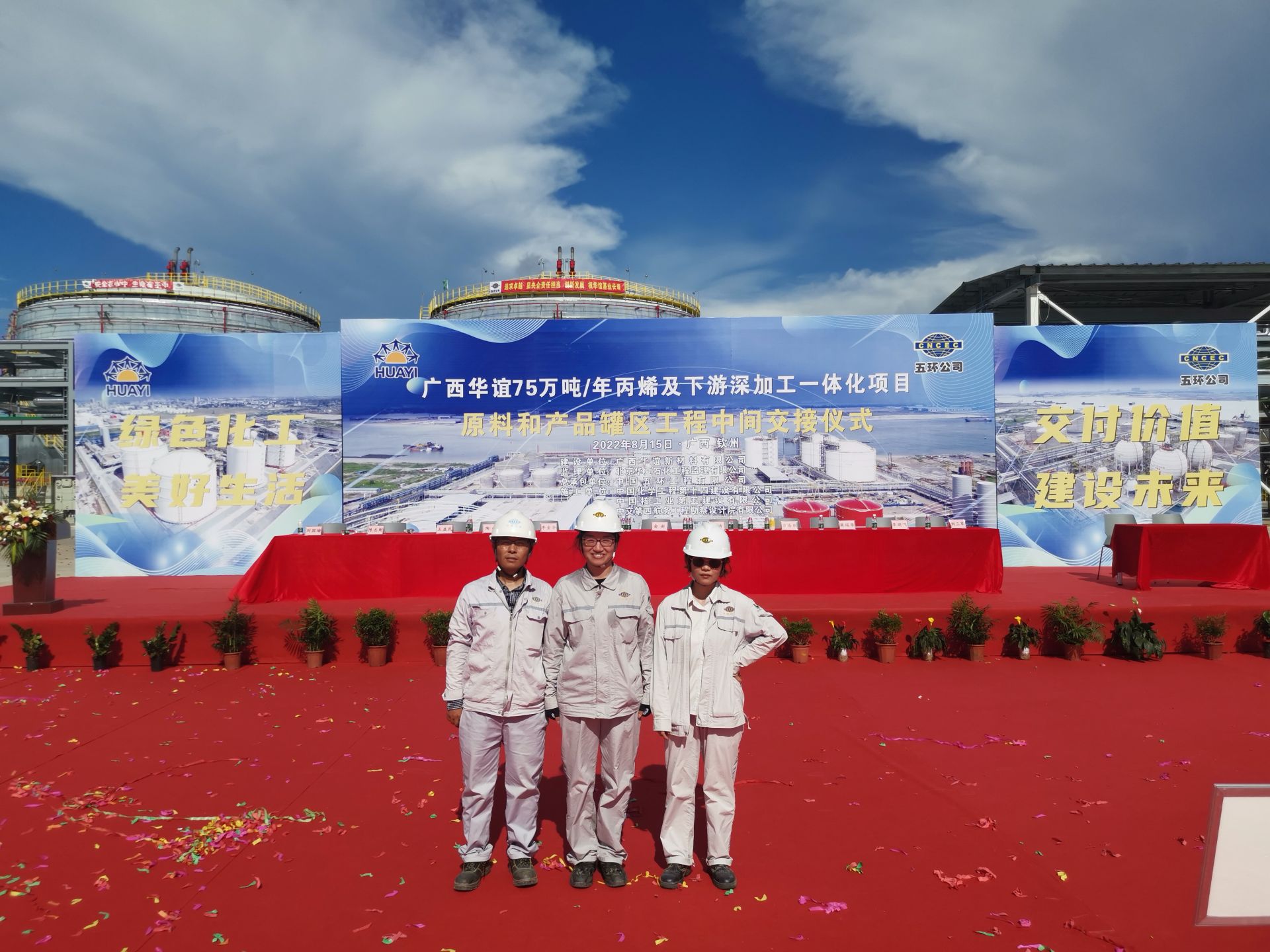 广西华谊新材料公司党委书记、董事长蒋兆飞,对中国五环和全体建设者的辛苦努力表示肯定和感谢。他说,18个月里,共同见证了原料和产品罐区从一片平地拔地而起,最终建成储罐林立、管廊交错、道路畅通的大型罐区。回顾建设历程,项目按期完成一个又一个里程碑节点,也见证了国内首次两台双金属低温罐同时升顶的壮举。