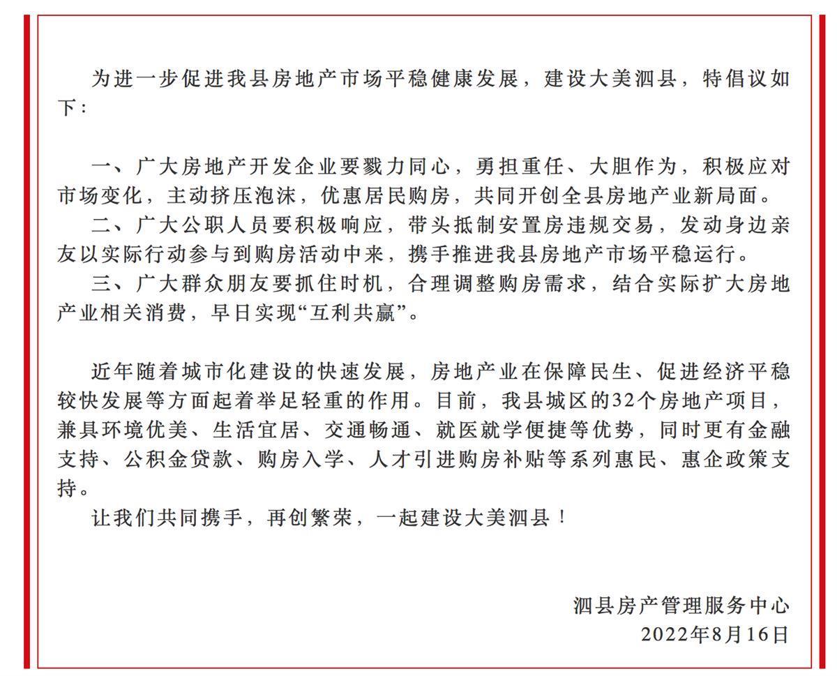 《关于共创房地产业繁荣的倡议书》(图片来源:泗县发布)