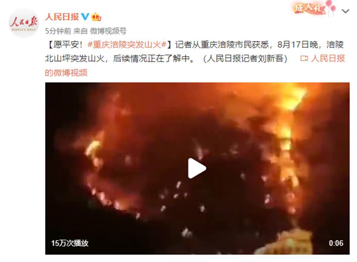 据人民日报消息,8月17日晚,涪陵北山坪突发山火,后续情况正在了解中。现场视频显示,山火蔓延,火光冲天,有消防人员正在救援。