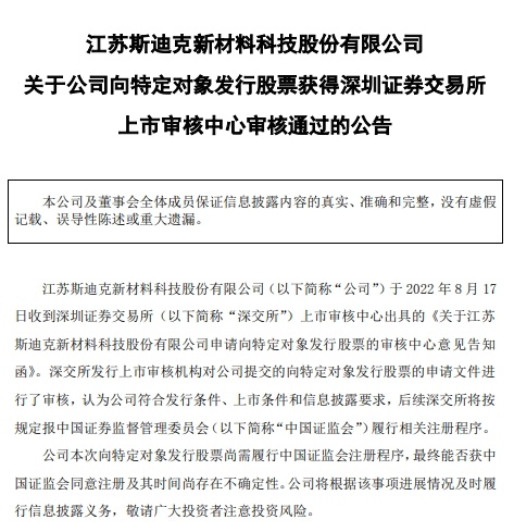 中国经济网北京8月18日讯 昨日晚间,斯迪克(300806.SZ)发布公告称,公司于昨日收到深交所上市审核中心出具的《关于江苏斯迪克新材料科技股份有限公司申请向特定对象发行股票的审核中心意见告知函》。深交所发行上市审核机构对公司提交的向特定对象发行股票的申请文件进行了审核,认为公司符合发行条件、上市条件和信息披露要求,后续深交所将按规定报中国证监会履行相关注册程序。