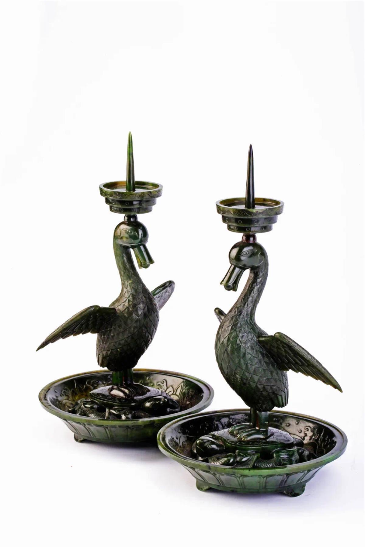 “海晏河清”出自唐代诗人郑锡的《日中有王子赋》,“河清海晏,时和岁丰。”比喻沧海波平,黄河水清,国家安定,天下太平。这对碧玉海晏河清烛台为清宫养心殿造办处制作的御用生活品,取“雁”与“晏”的谐音,形象呈现出“海晏河清”的美好寓意。