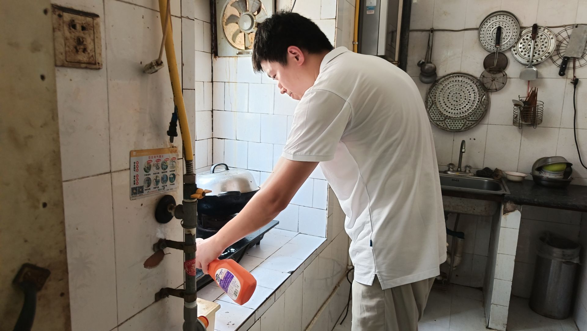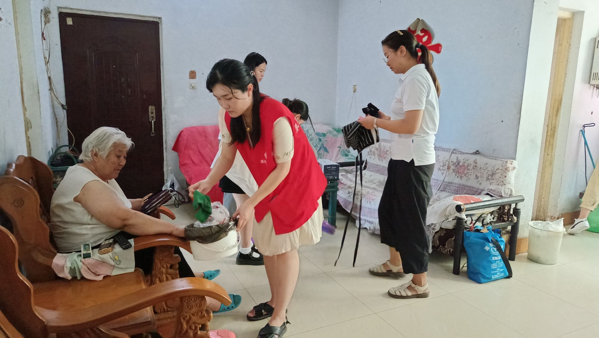 杨奶奶今年79岁,子女不在身边,长期单独居住使得杨奶奶家有些乱,志愿者们帮杨奶奶扫地、拖地、擦桌子、收拾杂物等,一会儿功夫家里变得干净整洁了。
