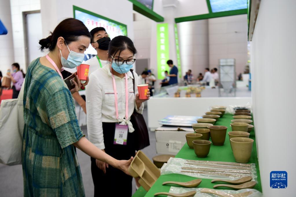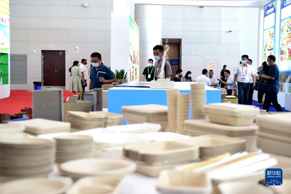 8月19日,与会者在2022安徽秸秆暨畜禽养殖废弃物综合利用产业博览会上观看秸秆餐具。