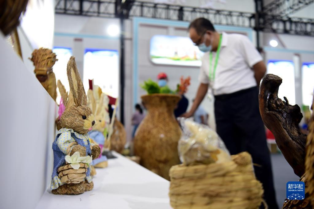 8月19日,与会者在2022安徽秸秆暨畜禽养殖废弃物综合利用产业博览会上观看用秸秆制作的工艺品。