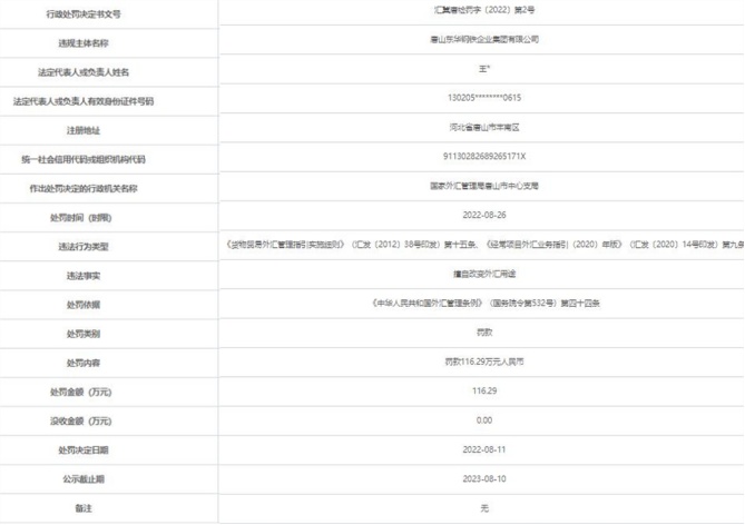 中国经济网北京8月19日讯 国家外汇管理局网站日前公布的行政处罚决定书(汇冀唐检罚字〔2022〕第2号)显示,唐山东华钢铁企业集团有限公司存在擅自改变外汇用途的违法事实,违反《货物贸易外汇管理指引实施细则》(汇发〔2012〕38号印发)第十五条、《经常项目外汇业务指引(2020)年版》(汇发〔2020〕14号印发)第九条规定。国家外汇管理局唐山市中心支局依据《中华人民共和国外汇管理条例》(国务院令第532号)第四十四条规定,对公司罚款116.29万元人民币,处罚决定日期2022年8月11日。