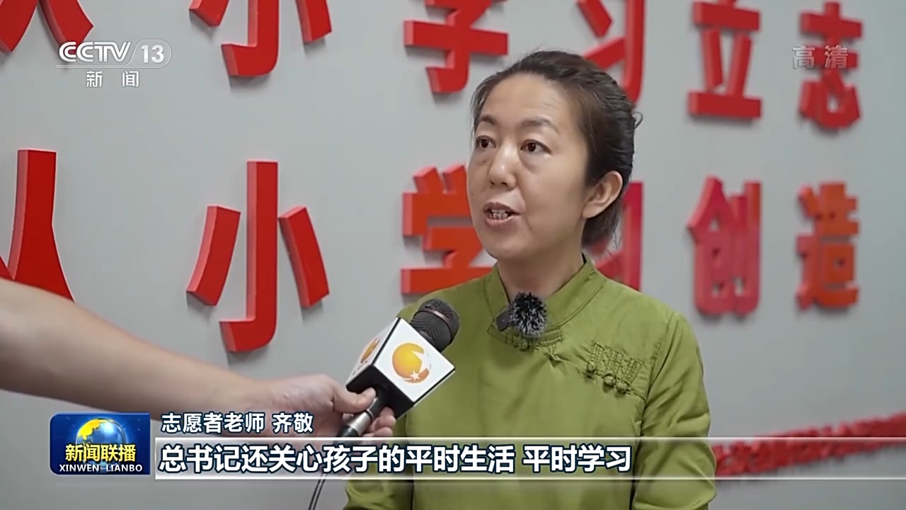 志愿者老师 齐敬:总书记非常关心孩子的全面发展,除了问我们绘画,总书记还关心孩子的平时生活,平时学习,我一定会在志愿者方面更加努力地去做,把美传到每一个孩子的心中。
