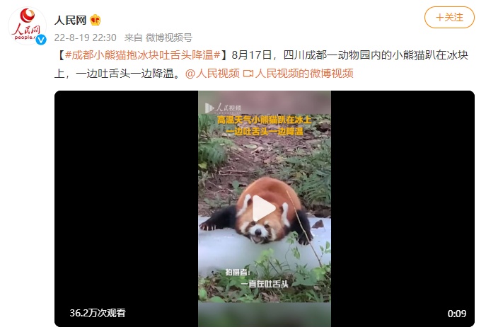 【成都小熊猫抱冰块吐舌头降温】近日,四川成都一动物园内的小熊猫趴在冰块上,一边吐舌头一边降温。