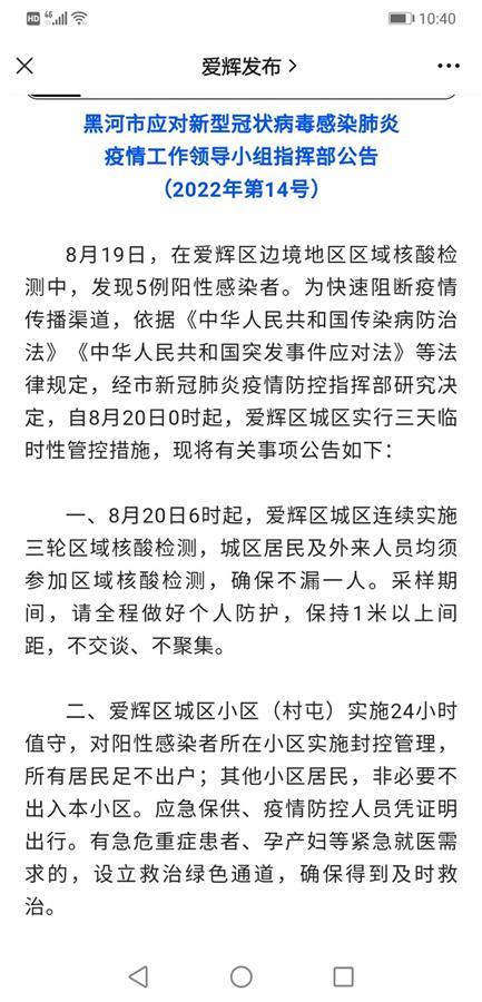据黑河市公告,8月20日6时起,爱辉区城区连续实施三轮区域核酸检测。爱辉区城区小区(村屯)实施24小时值守,对阳性感染者所在小区实施封控管理,所有居民足不出户;其他小区居民,非必要不出入本小区。对市区各交通道路、出入口和公共交通工具实行交通管制,人员和车辆未经批准严禁出入。公路客运车辆、公交车、出租车、网约车暂停营运,疫情防控工作人员和生活保障车辆由市(区)疫情防控指挥部批准后方可出入。个体诊所暂停营业,除保供超市、保供药店和医疗机构等场所外,其余商场、餐饮、洗浴、网吧、电影院、健身房、商铺等经营性场所暂停营业,早市夜市暂停开放。