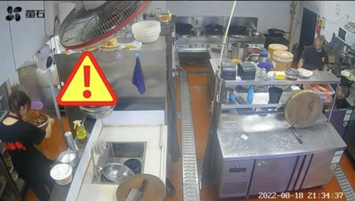 服务员端着锅进后厨时油突然溅起(视频截图)