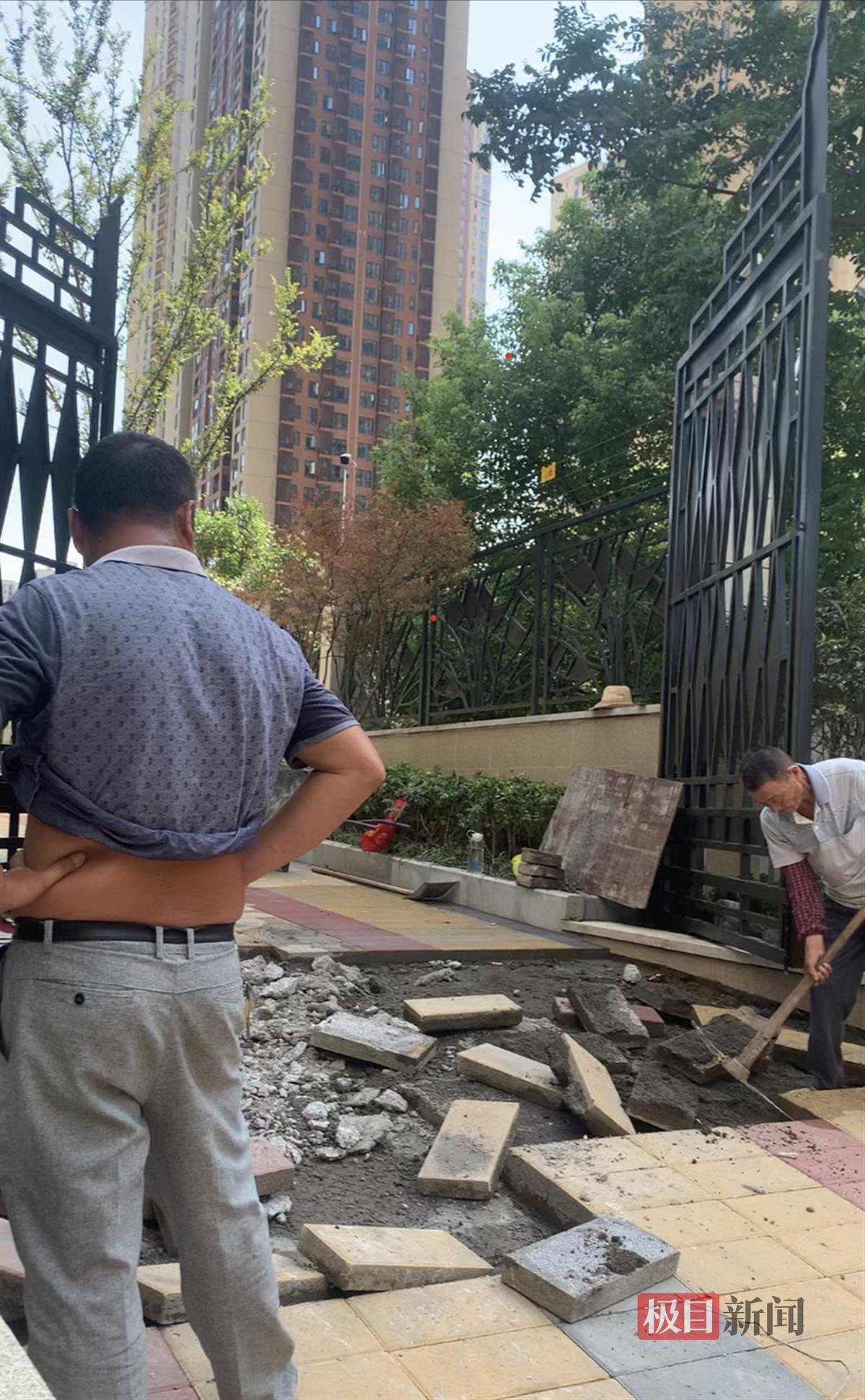 记者发现,目前该铁门四周已被黄色的水马围住,现场有3位工人在施工。“应该是业主误会了。之前有销售人员带客户来看房时,走过这个门。”一名施工人员王先生介绍说,之前黑色铁门上的一扇小门曾打开过,可能让部分业主误解。现在由于铁门下的消防通道过陡,他们正在对坡度进行改造,为了方便他们施工,消防门才打开了。王先生指着后面一栋楼说,这栋正在施工的楼是顶琇国际城15栋,现在不允许通行。顺着王先生所指的方向看去,发现15栋四周被绿色的围布挡着,无法通往别的楼栋。随后,记者来到顶琇国际城物业服务中心,工作人员表示,之前有业主也反映过类似情况,地产商已经用水马将此通道围挡起来,正在进行整改。由于该栋还未交付,物业人员称,何时完成整改还要问地产商。记者现场致电顶琇国际城售楼部,客服回应说,此前15号楼开放样板间时,有销售带过客户从此消防门进出。楼盘在12月底交付,交房后开放小区大门,消防门不对外开放。