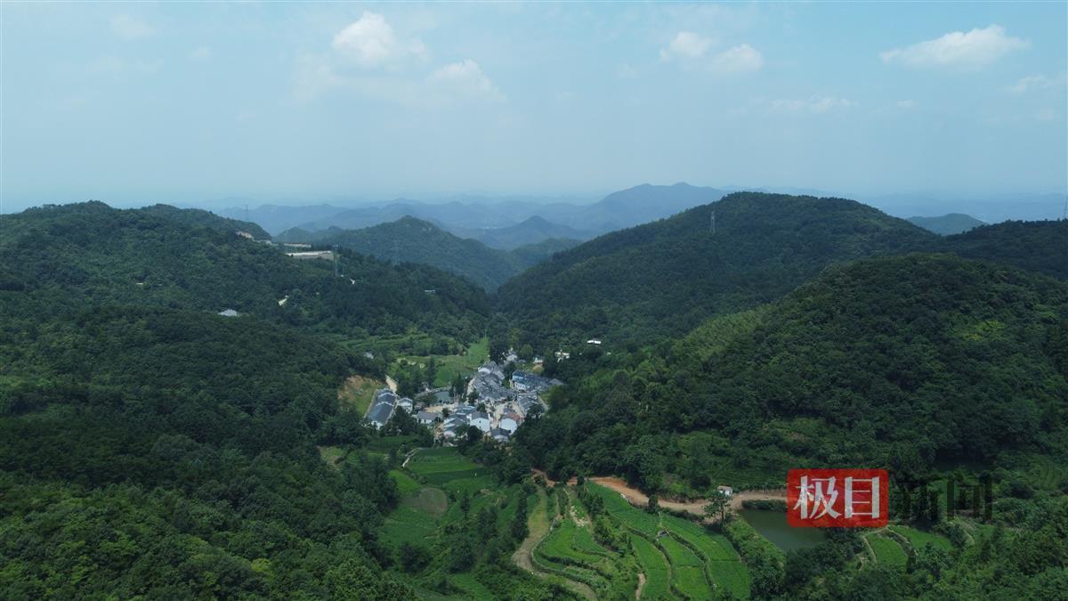村子不大,只有50多户人家,却是清一色的青砖黛瓦马头墙,徽派建筑依山而建,错落有致,古朴幽静;放眼望去,蓝天白云之下,路似飘带,丛林如海。