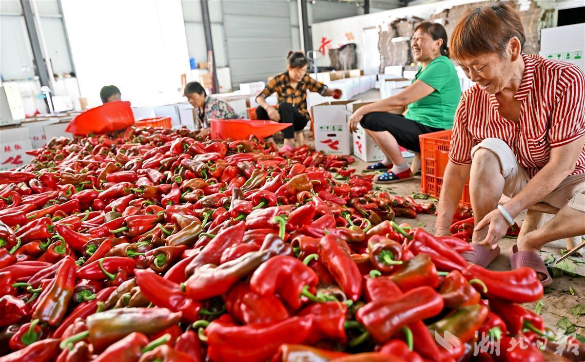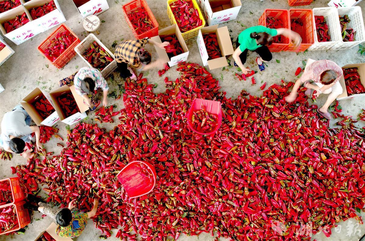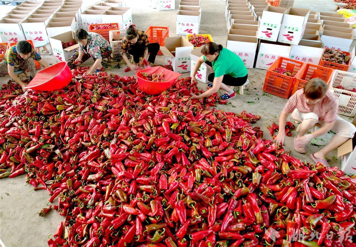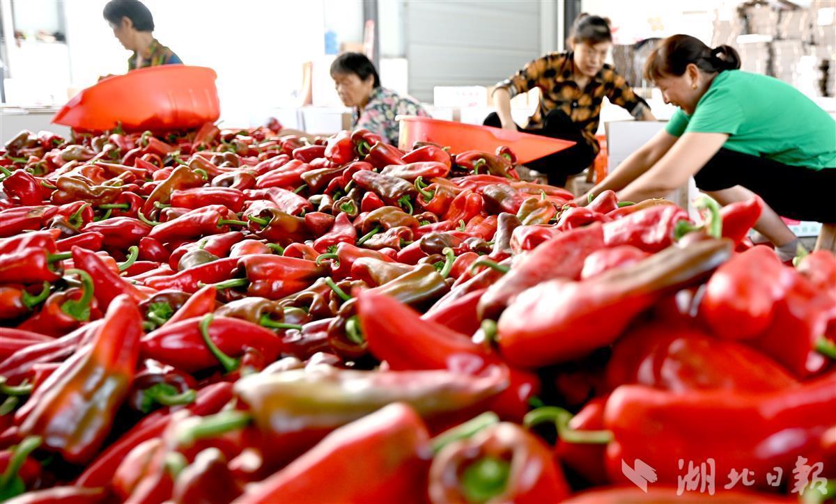 8月18日,在宜都市潘家湾土家族乡梁山村金萱蔬菜专业合作社,现场一片繁忙,农业工人们正在加紧分拣、打包新采摘的红辣椒,即将发往武汉、长沙、厦门等地批发市场。