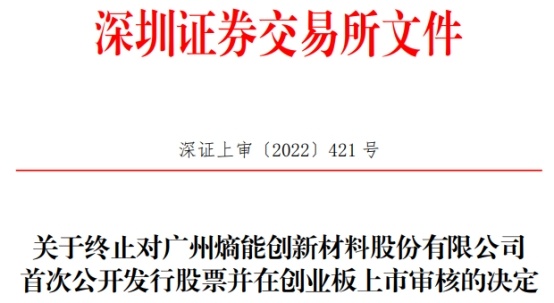 2022年8月17日,熵能新材向深交所提交了《广州熵能创新材料股份有限公司关于撤回首次公开发行股票并在创业板上市申请文件的申请》,保荐人向深交所提交了《民生证券股份有限公司关于撤回广州熵能创新材料股份有限公司首次公开发行股票并在创业板上市申请文件的申请》。根据《深圳证券交易所创业板股票发行上市审核规则》第六十七条的有关规定,深交所决定终止对熵能新材首次公开发行股票并在创业板上市的审核。