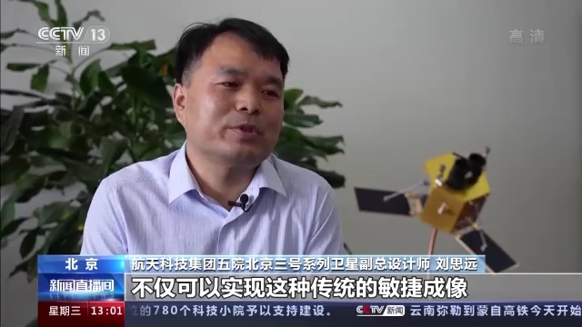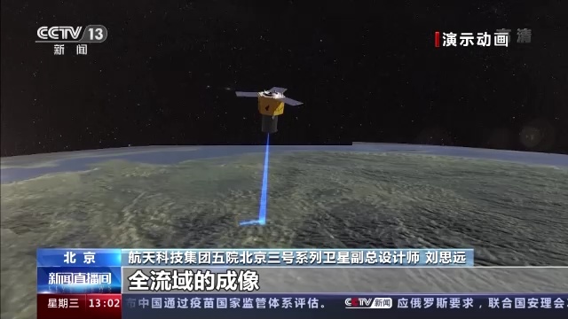航天科技集团五院北京三号系列卫星副总设计师 刘思远:基于这样一个平台,我们卫星不仅可以实现传统的敏捷成像,也就是一轨进行多个点目标成像,或者是进行这种立体成像,或者对同一个目标进行多角度成像,(它)还具有比较特殊的成像模式,也就是沿任意航迹成像。