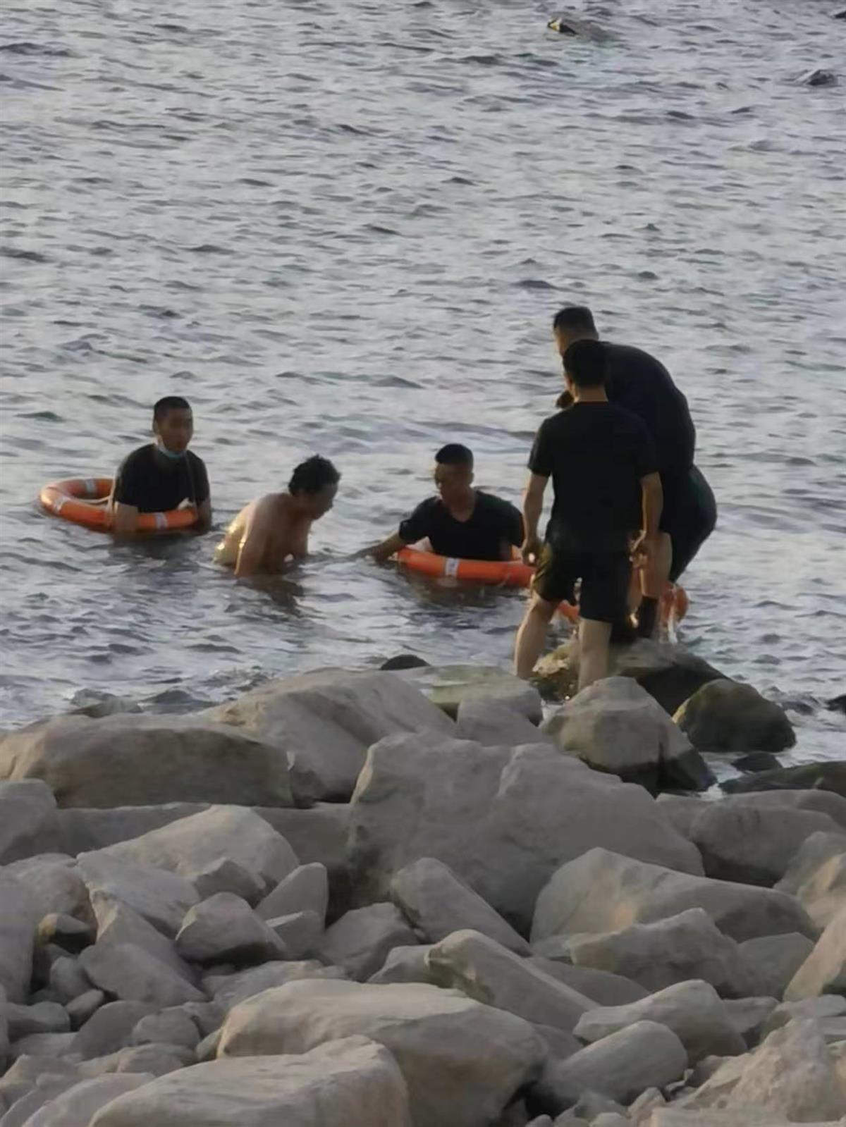 “程磊、李禹铮,拿救生圈救人,执行任务,快!”紧急关头,排长吴飞从组织熟练水性的战士下水救援。他们以冲锋的姿态,快速翻越江边围栏,奔向事发地岸边。