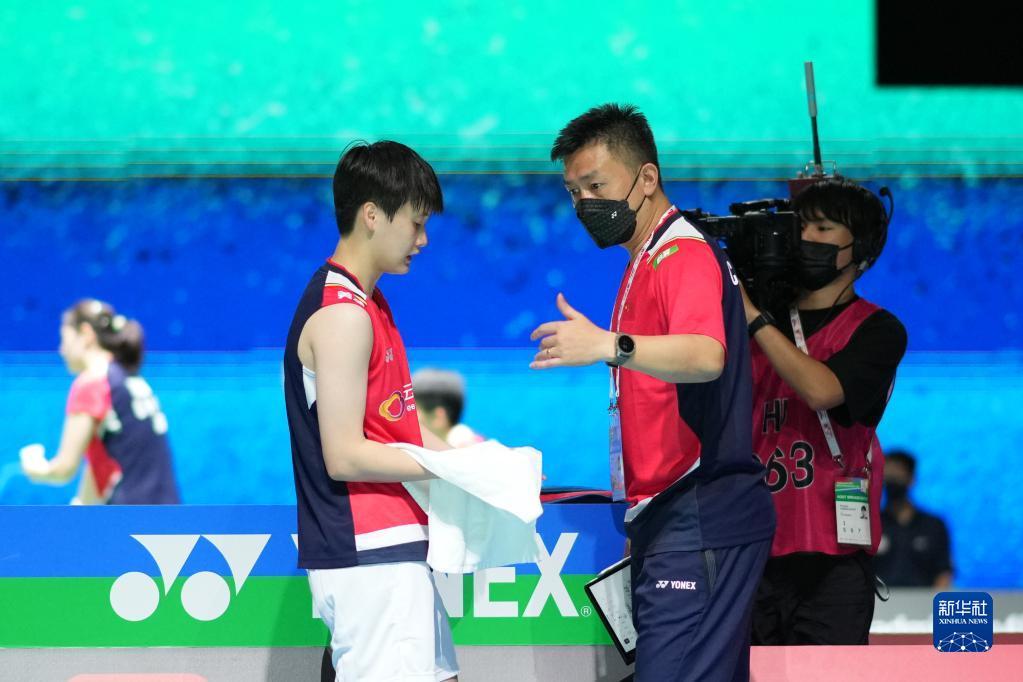 8月24日,陈雨菲(左)在比赛间隙接受教练指导。新华社记者 张笑宇 摄
