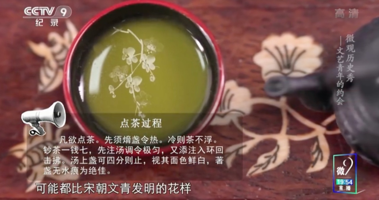 宋人饮茶流行点茶,先把处理好的茶叶末放入提前预热好的茶盏中,注入少量沸水调成糊状,再注入沸水快速搅动,产生茶沫,形成一层茶花,七次击拂后,能看到拉花,还能作画。
