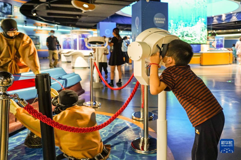 8月24日,小朋友在威海海洋科技馆内参观游玩。