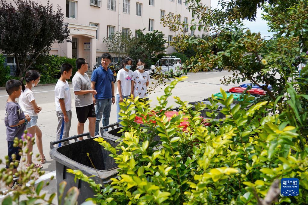 8月24日,威海市魏桥社区工作者张帅克(右三)和孩子们一起讨论社区垃圾分类管理问题。去年7月,该社区成立由不同年龄段少年儿童组成的儿童议事会,为儿童提供平等对话平台。