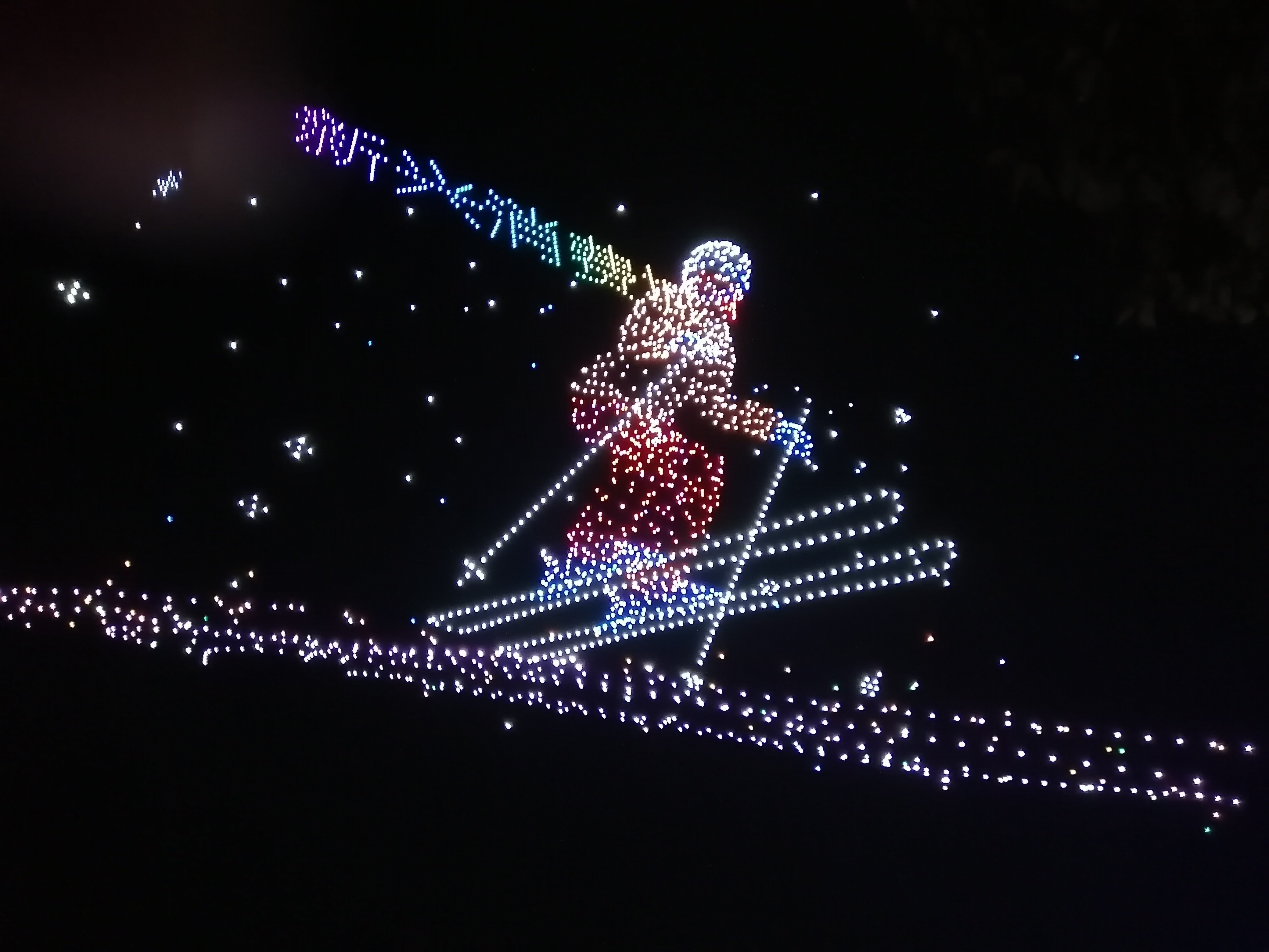 8点整,夜空被一束束灯柱划破,伴着激昂的音乐,2022架无人机的队形变幻在灯光变化中一一呈现,代表生命希望的种子、向前滑雪的运动员、环绕地球的“吉林一号”卫星,在观众的声声惊叹中依次闪耀。