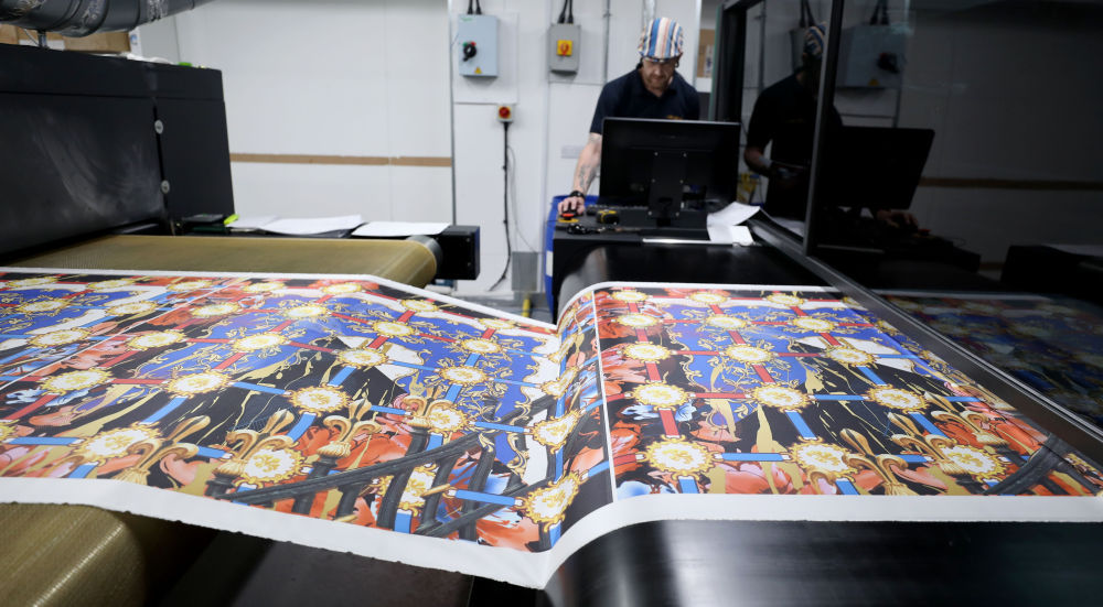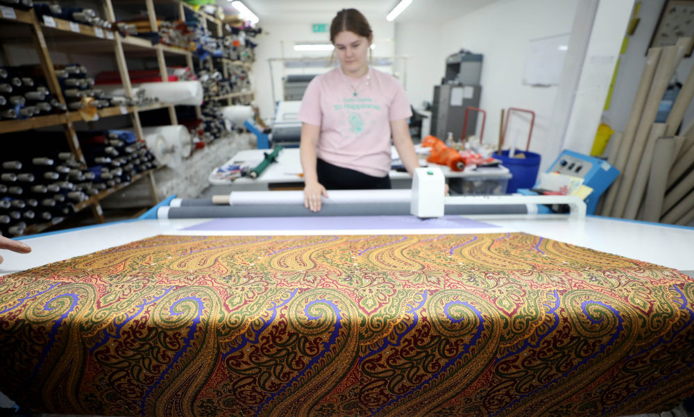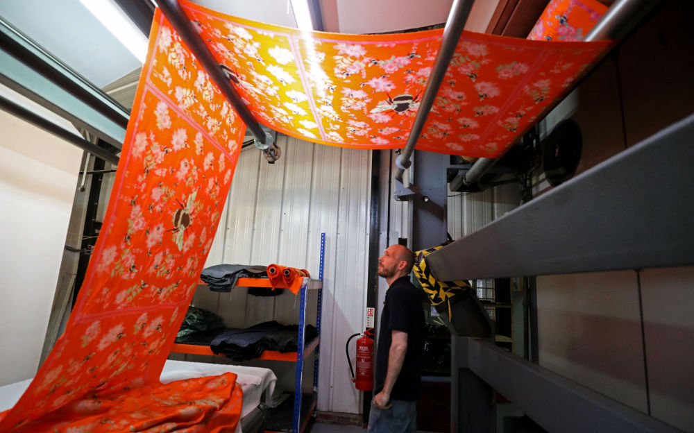 ↑8月11日,在英国麦克尔斯菲尔德一家丝绸工厂,工作人员展示丝绸产品。
