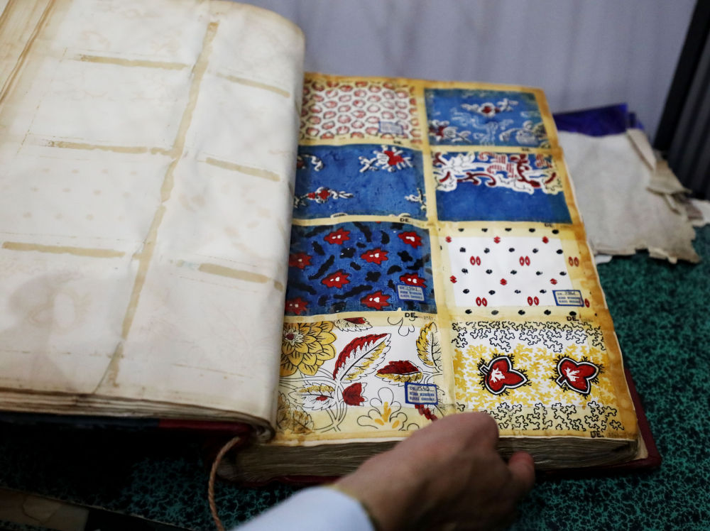 ↑8月11日,在英国麦克尔斯菲尔德一家丝绸工厂,工作人员展示有关丝绸的古代书籍。