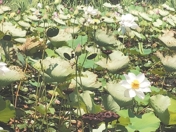 从景区出来返回官田村,一大片荷花池映入眼帘,片片荷叶铺展水面,朵朵荷花绽放飘香。