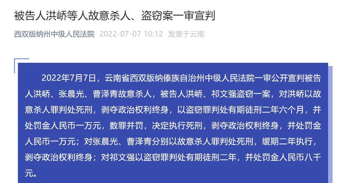 2022年7月7日上午,“南京女大学生被害案”在西双版纳州中级人民法院迎来一审判决:被告人洪峤以故意杀人罪被判处死刑,剥夺政治权利终身;另两名被告人张晨光、曹泽青以故意杀人罪被判处死刑,缓期二年执行,剥夺政治权利终身。法院判决书中提到,在该起故意杀人共同犯罪中,洪峤系犯意提起者、策划者、指挥者,三被告人均系主犯,其中洪峤的地位最高,罪责最为突出。