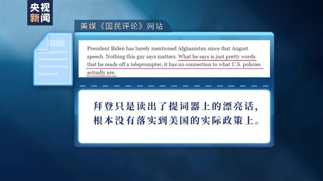 美国《国民评论》网站近日还发表文章,称拜登去年8月底从阿富汗撤军前,曾口口声声说,要支持和援助阿富汗人民。然而,这个承诺根本没有兑现。文章直言,“拜登只是读出了提词器上的漂亮话,根本没有落实到美国的实际政策上。”