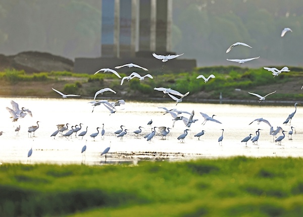 8月25日,在武汉市东西湖区府河河滩上,夕阳映照河面,大批白鹭在此觅食、栖息。目前翔集于府河的主要是白鹭和中白鹭,每年8月至9月,鸟群在武汉繁殖后会集群休整,多见于府河河滩,待到9月底便往广东、云南等地迁徙,更远可飞到东南亚。