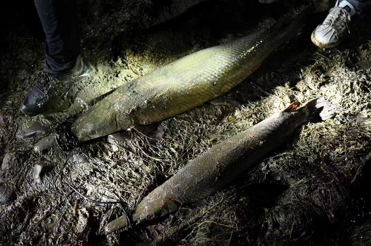 27日上午,一名抓捕队员表示,26日夜间12点多钟将一大一小两条鳄雀鳝抓获,大的体重25斤以上,小的十几斤重,“我们是把水抽得差不多的时候,进入管道100多米的深处将其抓获,当时水位不到一米。”