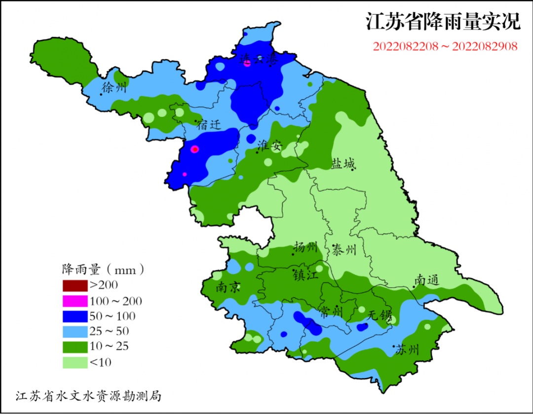 上周江苏出现两次降雨过程。8月22日,江苏淮河以北中到大雨,局部暴雨;23日江苏沿淮地区中到大雨;25日全省大部分地区分散性小雨;26日江苏淮河以南地区小到中雨,苏南部分地区大雨,局部暴雨;27日江苏沿江苏南地区小到中雨,其他地区分散性小雨。全省累计面雨量22.1毫米,其中淮北地区38.3毫米、江淮之间7.3毫米、苏南地区25.1毫米。