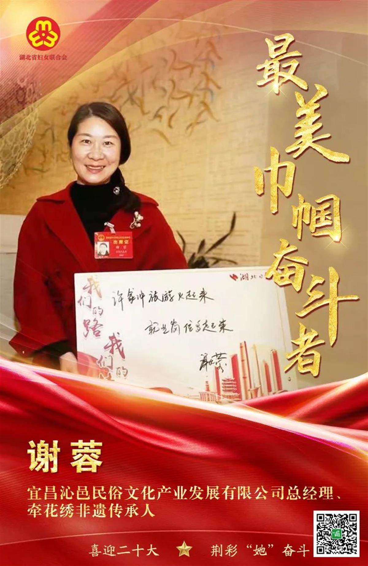 谢蓉,宜昌市夷陵区太平溪镇许家冲村的村民,宜昌沁邑民俗文化产业发展有限公司总经理、牵花绣非遗传承人,也是宜昌市夷陵区、镇、村妇联执委。她带头成立了“宜昌绣女工艺品专业合作社”“宜昌沁邑民俗文化产业发展有限公司”,将传承本地传统民间手工艺“牵花绣”,发展民宿产业,带动更多移民致富增收。2018年4月24日,习近平总书记视察许家冲村,她向习近平总书记汇报移民的工作生活情况,得到了习近平总书记的点赞。她先后获评2020年度全国三八红旗手、“全国乡村文化和旅游能人”、“全国农村电商致富带头人”等荣誉称号,并当选省十二次党代会代表、湖北省十三届人大代表,中国妇女十二大代表。