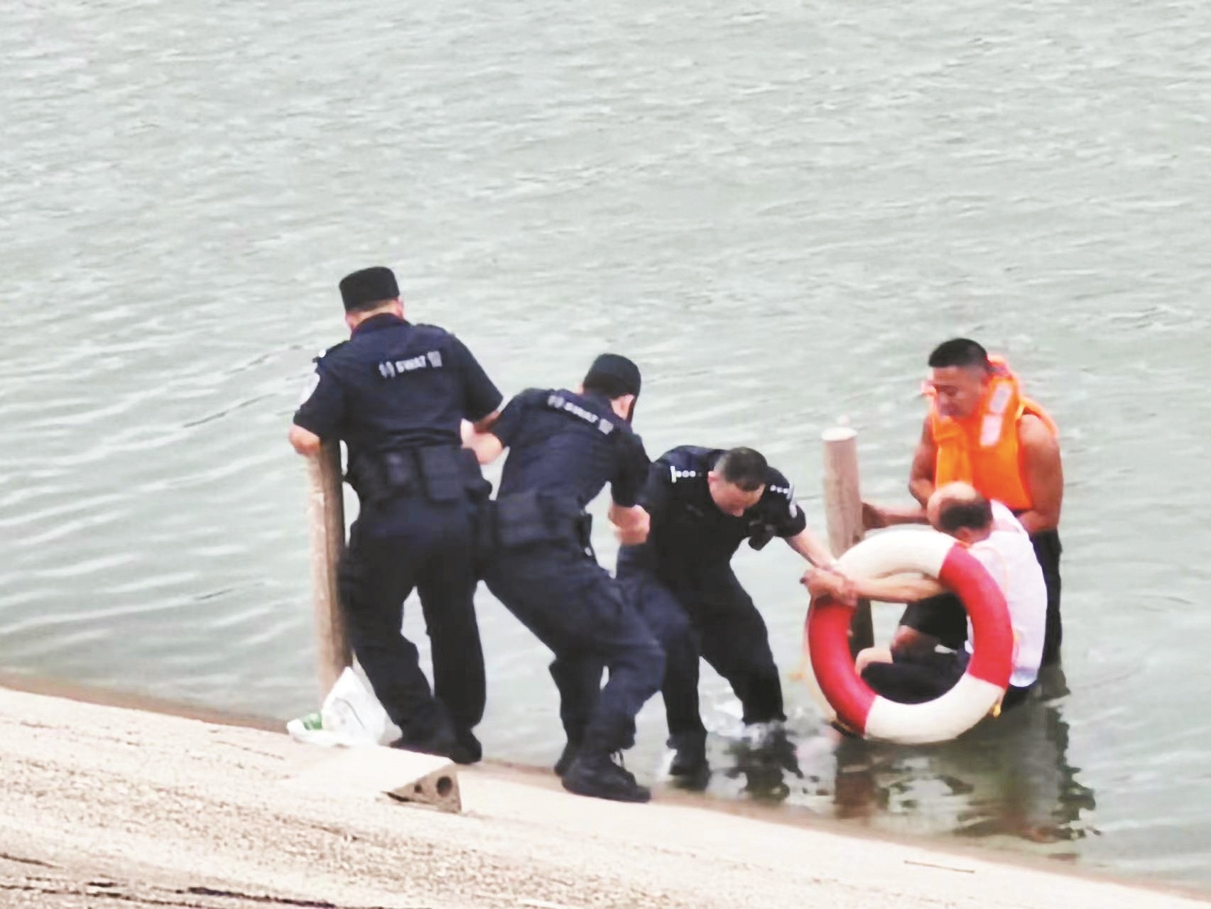 楚天都市报极目新闻讯(记者刘俊华 通讯员张俊芳 覃楷)8月28日下午3时许,宜昌市公安局反恐特警支队葛洲坝警务站民警在江边巡逻,发现江水中有一老人正抓着量水杆奋力挣扎。巡逻民警万芳邑、乔冠中、胡先澔、辅警白传剑与正在江边锻炼的情指战中心民警周柏林迅速反应,使用救生衣与救生圈快速在现场展开救援,大家齐心协力一同将落水老人救起。