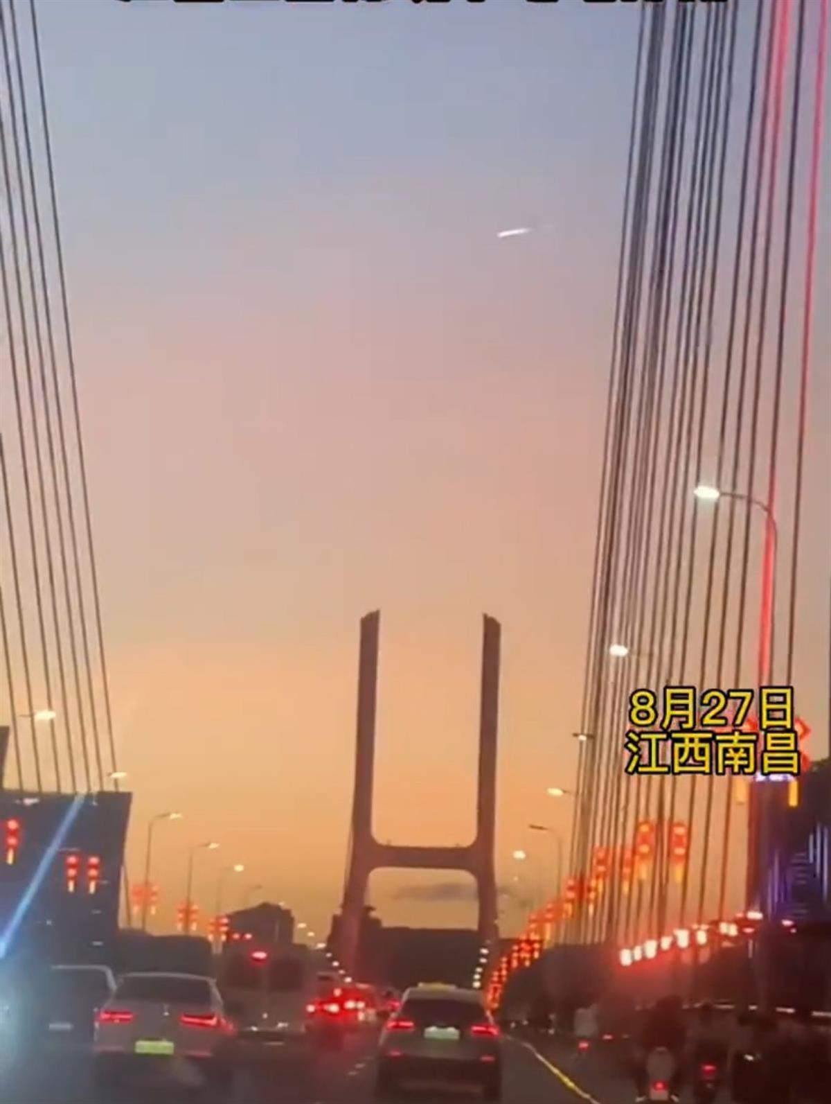 网传视频显示,在一座大桥附近上空,一个拖着长长“尾焰”的不明物体,快速划过天空。视频中两人对话称:“那是什么东西?卫星吗?”“不知道哎”。