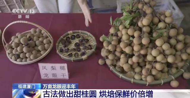 总台记者 韩志涛:大家看我手里拿的就是通过烘焙技术,做出的龙眼干,我们也叫桂圆。在同安很多果园的附近,都有一个传统的小型烘焙作坊。烤炉的一头燃烧的是炭火,通过它传导过来的热风来蒸发龙眼的水分。这个烤箱要维持在70℃,在这需要反复烘烤24小时。我身边这些就是刚出炉的龙眼干,果型依然完整圆润,果肉非常有光泽,口感会更加香甜浓郁。目前,在同安有30多家专业合作社通过鲜果采摘、干货烘焙、统一销售等方式带动农民增产增收。依靠龙眼种植,每亩地效益能达到1万3000多元,今年当地龙眼的总产值预计在1.5亿元。甜美的龙眼果,实实在在成为乡亲们的致富果。