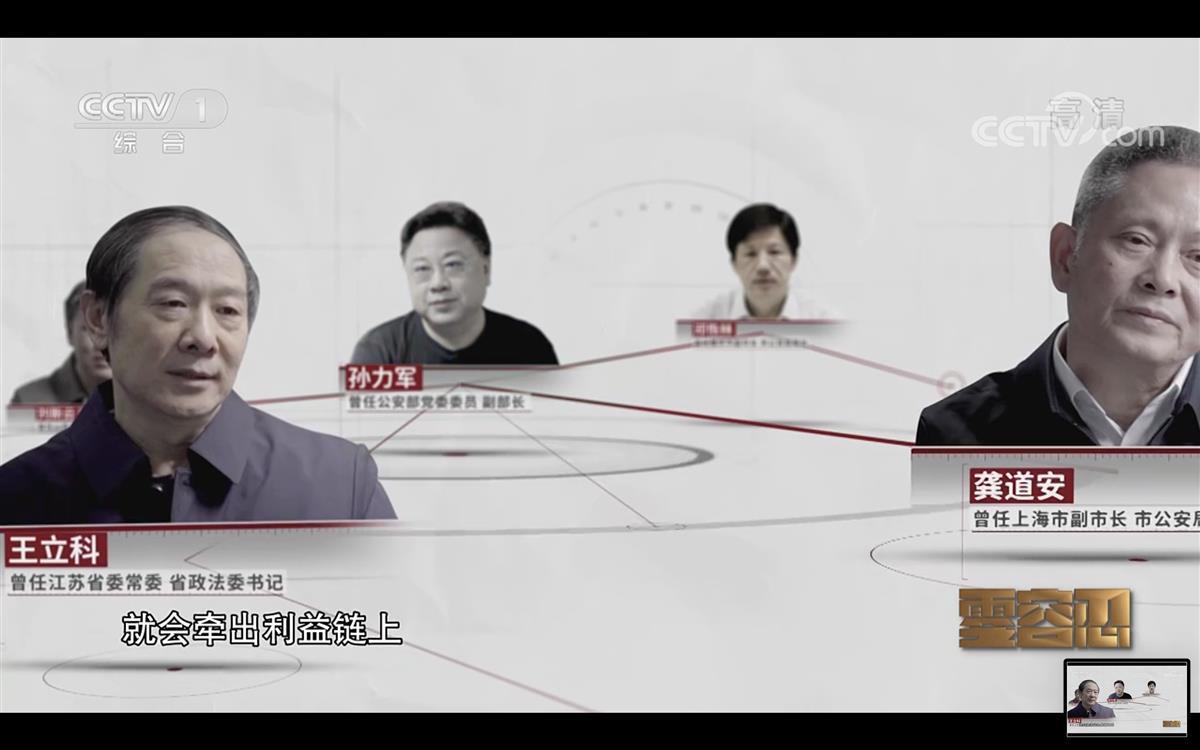 今年1月15日,电视专题片《零容忍》第一集《不负十四亿》中披露,紧随孙力军之后,政法领域多名省部级干部先后被查处:龚道安,曾任公安部技术侦察局局长,上海市副市长、市公安局局长,2021年2月被开除党籍和公职;邓恢林,曾任中央政法委办公室主任,重庆市副市长、市公安局局长,2021年1月被开除党籍和公职;王立科,曾任辽宁省公安厅副厅长、大连市公安局局长,江苏省副省长、省公安厅长,江苏省委常委、政法委书记,2021年9月被开除党籍和公职;刘新云,曾任公安部网络安全保卫局局长,山西省副省长、省公安厅厅长,2021年8月被开除党籍和公职。