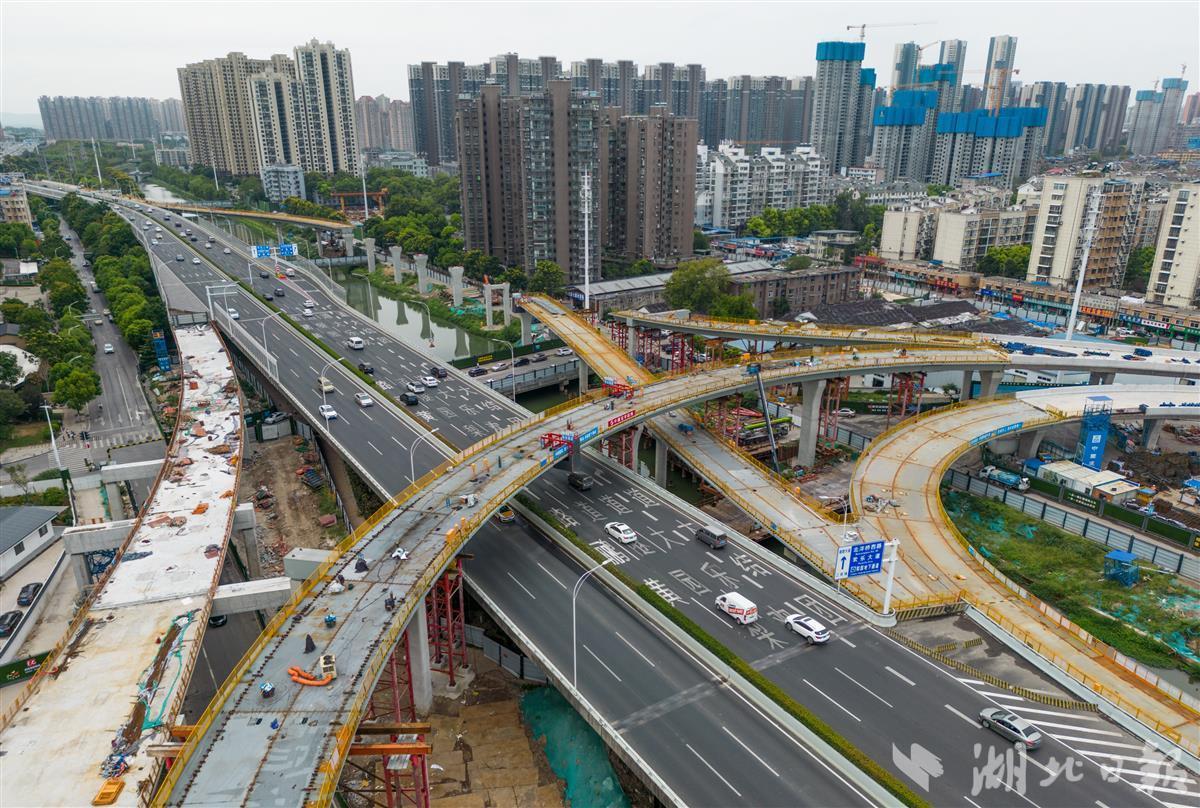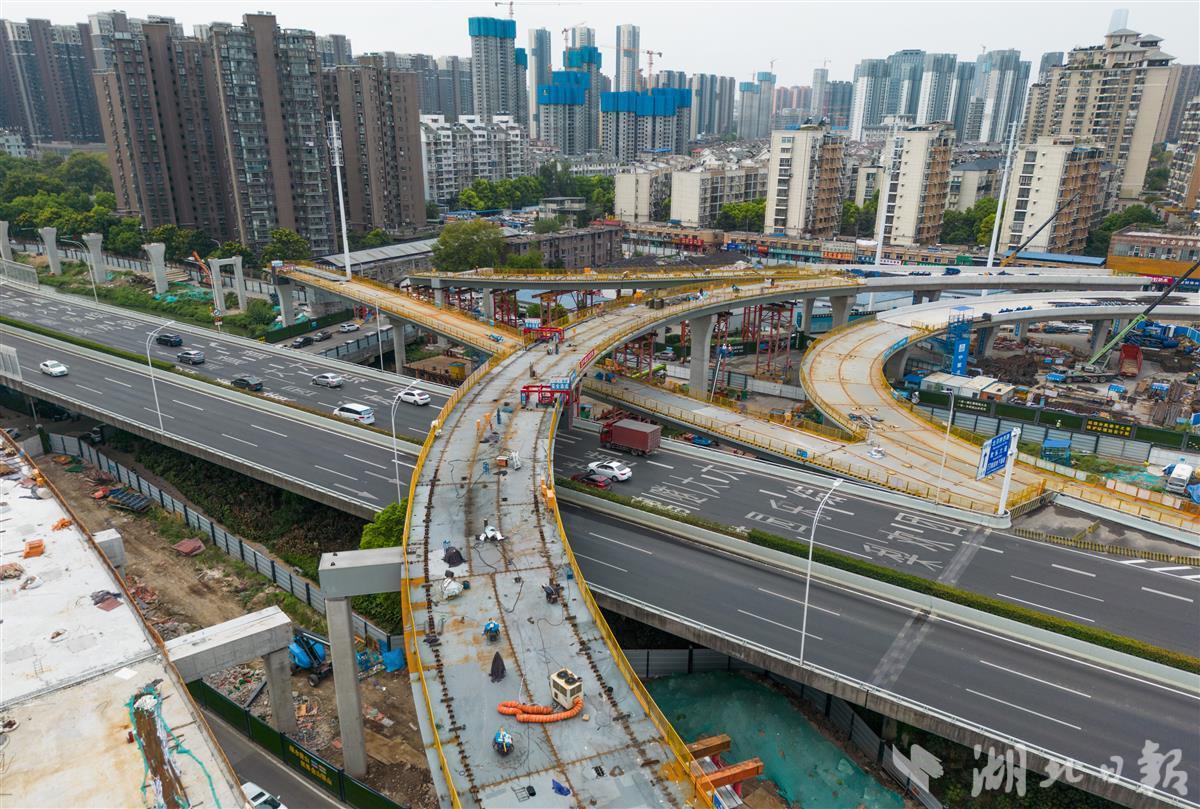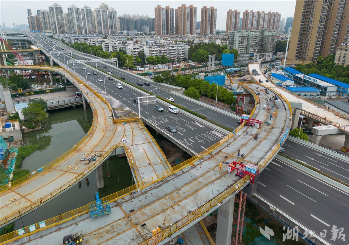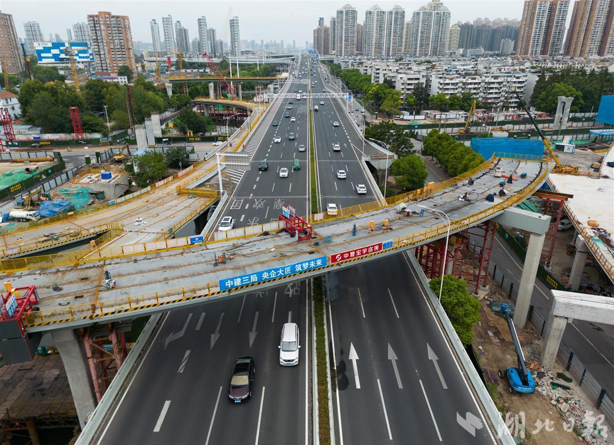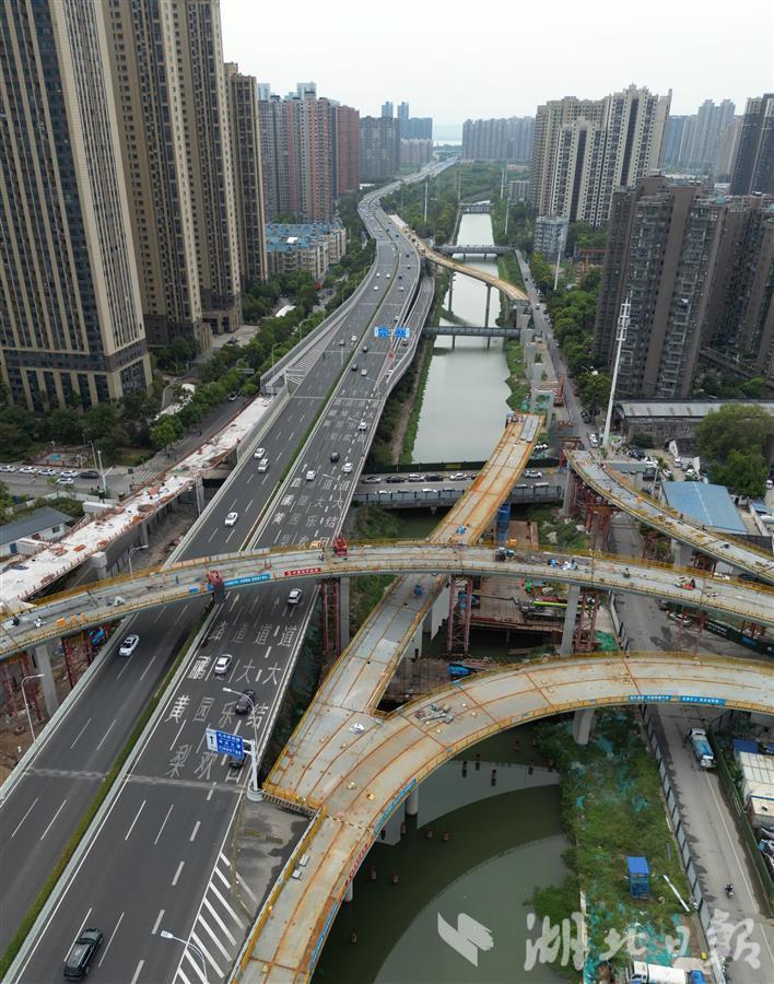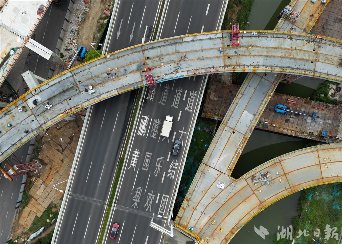 9月1日,武汉友谊大道快速化改造北段工程建设现场,新建的罗家港全互通立交一条匝道已跨越繁忙的二环线。