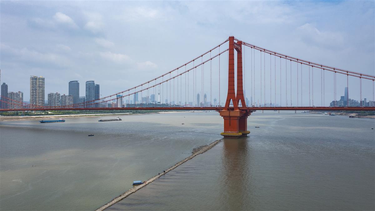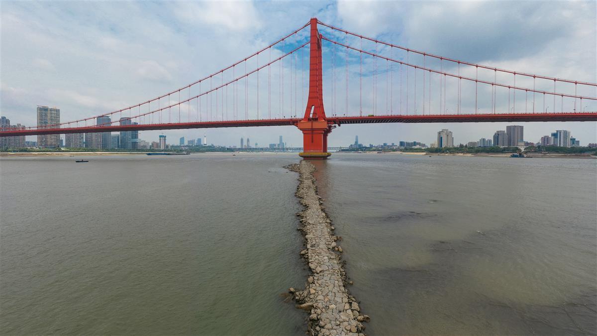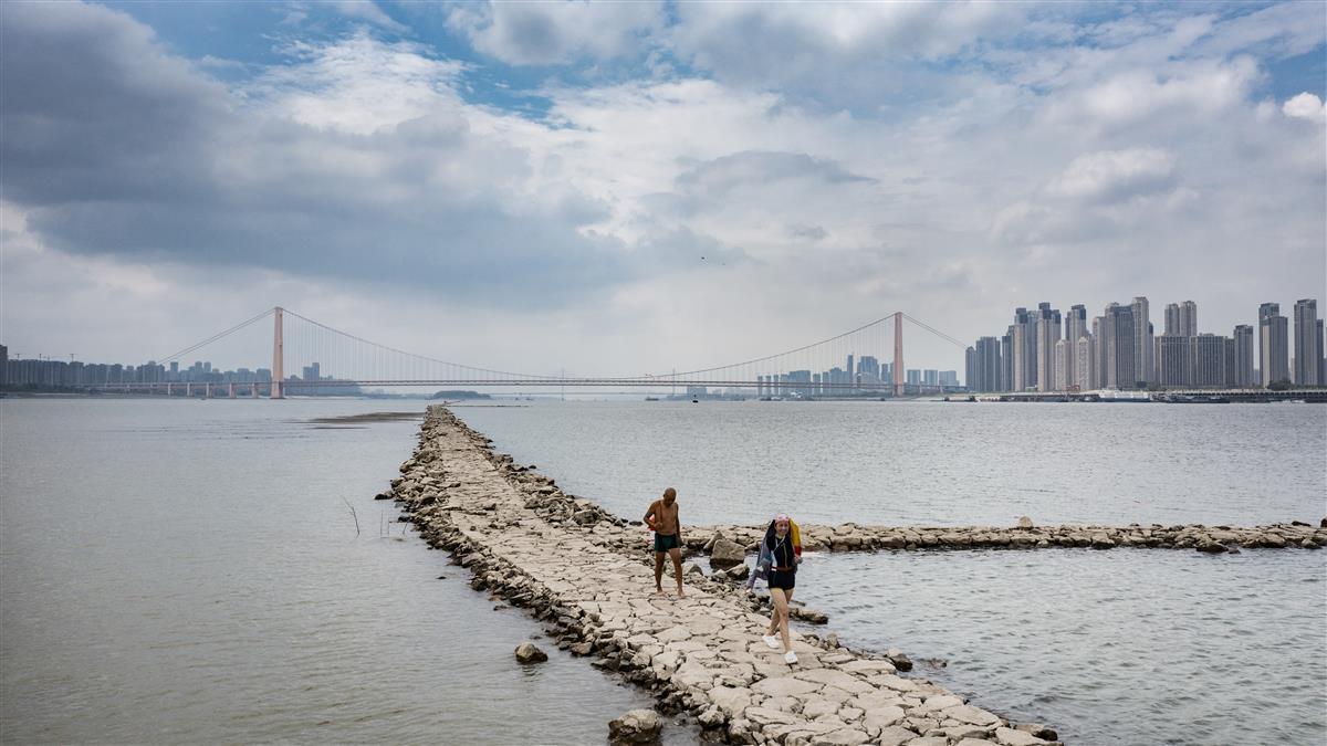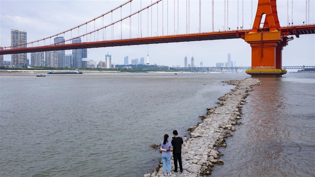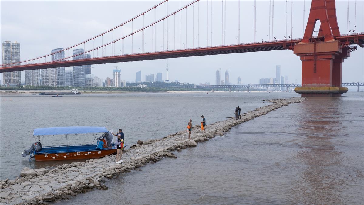 9月1日,在武汉鹦鹉洲长江大桥下,受近日长江武汉段水位持续下探影响,一段江心小路露出水面,不少游泳爱好者游到这里上岸打卡拍照。这条丁字坝是航道的整治建筑,在修建鹦鹉洲大桥时所建。因该处附近江面较宽,为了让江水集中利于行船,所以修建了丁字坝。(湖北日报全媒记者 何宇欣 摄)