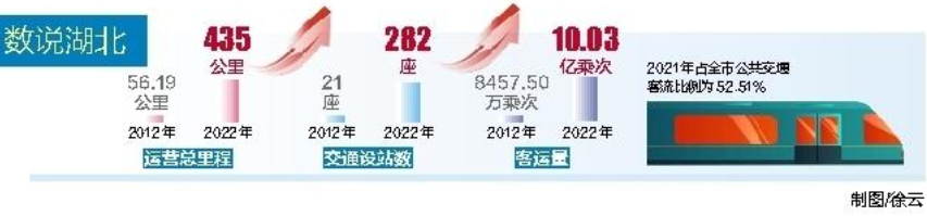 享受便利、感受文化,地铁已成为武汉人生活的一部分。据统计,2012年至2021年,武汉轨道交通已累计安全运送旅客68.19亿乘次。2021年,轨道交通占全市公共交通客流比例达到52.51%。