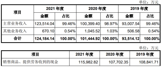 2019年至2021年,新巨丰主营业务收入分别为93,007.54万元、100,399.40万元、123,514.04万元,销售商品、提供劳务收到的现金分别为108,841.71万元、107,702.35万元、115,982.82万元。