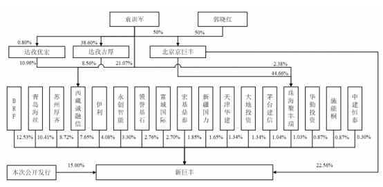 本次发行前,北京京巨丰直接持有新巨丰94,764,543股股份,占公司本次发行前总股本的26.54%,为公司控股股东;北京京巨丰的股东为袁训军、郭晓红夫妇,二人分别持有北京京巨丰50.00%的股权,通过北京京巨丰间接持有公司26.54%的股权;袁训军作为公司股东西藏诚融信、珠海聚丰瑞的执行事务合伙人,通过西藏诚融信、珠海聚丰瑞实际控制公司10.20%的股权。袁训军、郭晓红夫妇对公司合计实际控制的股权为36.74%,为公司实际控制人。