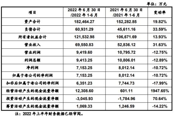 2022年1-6月,新巨丰营业收入为69,550.83万元,同比增长31.63%;净利润为7,153.25万元,同比下降10.72%;归属于母公司的净利润为7,153.25万元,同比下降10.72%;扣非后归属于母公司的净利润为6,351.23万元,同比下降17.99%;经营活动产生的现金流量净额为12,308.60万元,同比增加1947.65%。