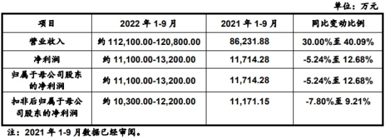 2022年1-9月,新巨丰预计营业收入约112,100.00万元至120,800.00万元,同比变动30.00%至40.09%;净利润约11,100.00万元至13,200.00万元,同比变动-5.24%至12.68%;归属于母公司股东的净利润约11,100.00万元至13,200.00万元,同比变动-5.24%至12.68%;扣非后归属于母公司股东的净利润约 10,300.00万元至12,200.00万元,同比变动-7.80%至9.21%。