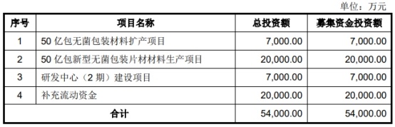 新巨丰2022年8月30日披露的招股书显示,公司拟募集资金54,000.00万元,计划用于50亿包无菌包装材料扩产项目、50亿包新型无菌包装片材材料生产项目、研发中心(2期)建设项目、补充流动资金。